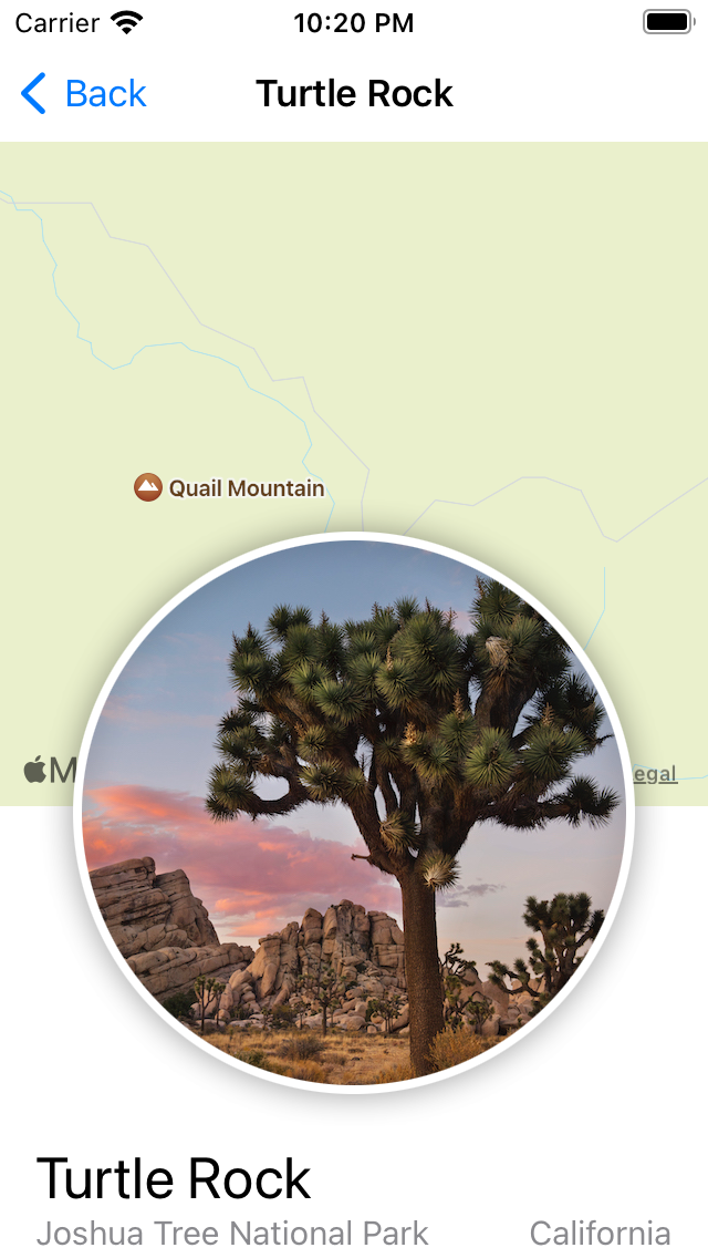 Once the user clicks one of the NavigationLinks within the list, the user is presented with a LandmarkDetail view, presenting a map, a rounded picture, and some text: