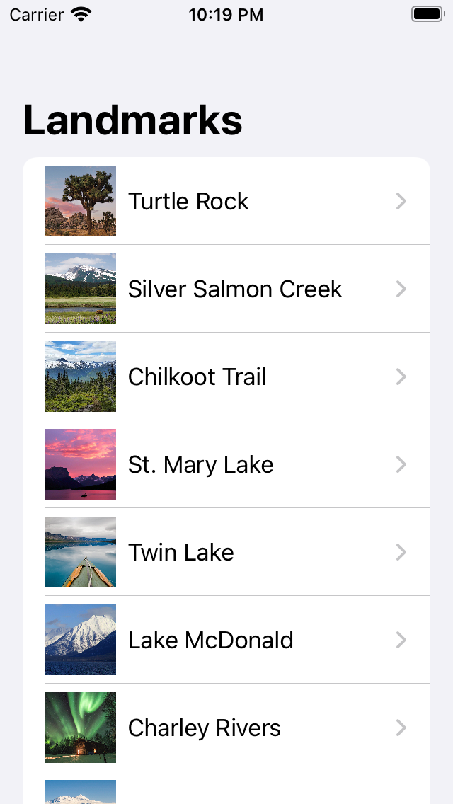 Yesterday and today, I followed two parts of Apple’s SwiftUI tutorial: Creating and Combining Views and Building Lists and Navigation. These two parts taught me how to implement a simple, yet aesthetically very pleasing interface for a tourist guide app called Landmarks.