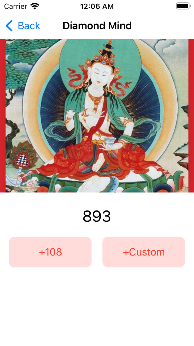 In order for the application to be usable, the application must allow the user to input arbitrary numbers of repetitions. Usually, the repetitions are counted with a mala, or prayer beads. A Buddhist mala has 108 beads, but a practitioner may also choose to count a full round as 100, or they may have done an irregular amount of repetitions during their session (e. g. 50 or 225). The application that my design and functionality is based on is iMala — Meditation Tracker. For some reason, the version I use every day has been removed from the App Store and replaced with a new one. In the app that I use, the practice view looks like this: